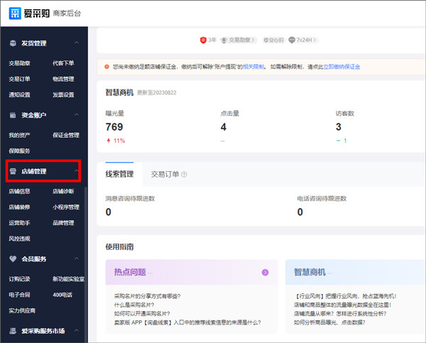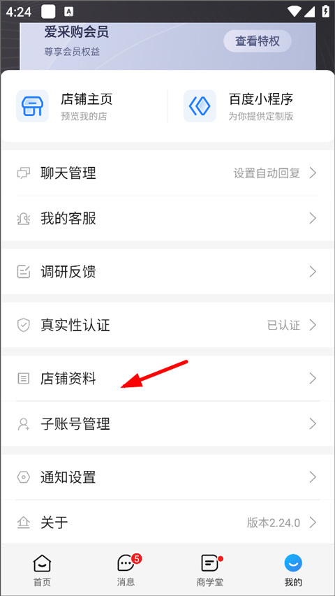 3、在我的页面中,用户可查看爱采购店铺主页、聊天管理、我的客服以及真实性认证等,点击店铺资料可查看修改。