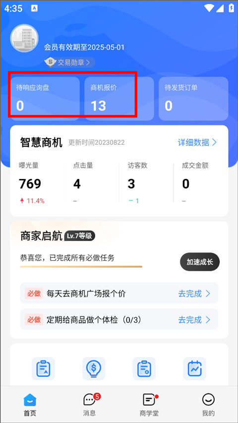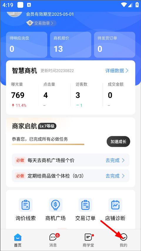 2、登录进入首页,用户在首页可查看会员有效期、商机广场、询价线索、交易订单等,点击我的;