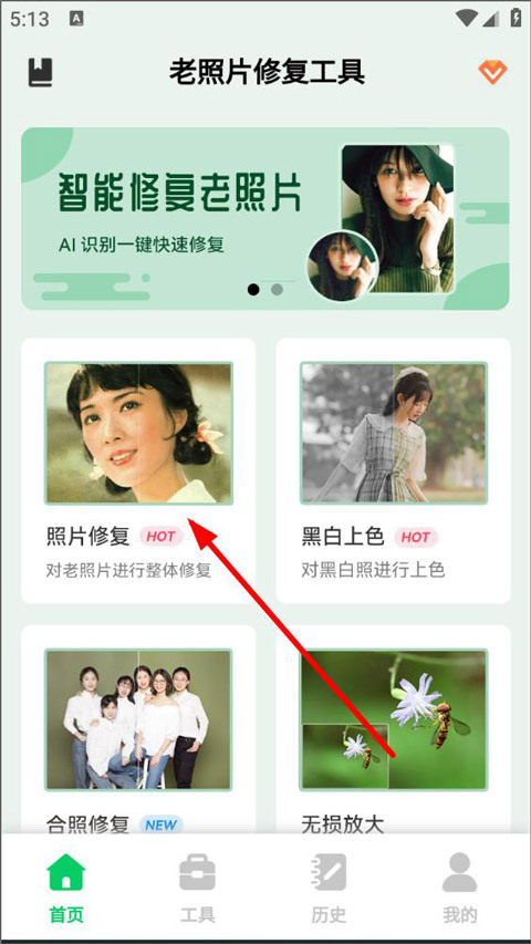 1、打开老照片修复app,登录进入主页,主页功能有照片修复、黑白上色、合照修复、无损放大、智能美颜、进阶修复等,点击照片修复;
