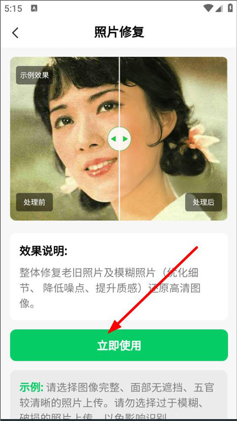 2、在照片修复页面,用户可以浏览示例图片和效果说明。请确保上传的图片完整、面部没有遮挡且五官清晰,然后点击“立即使用”上传照片。