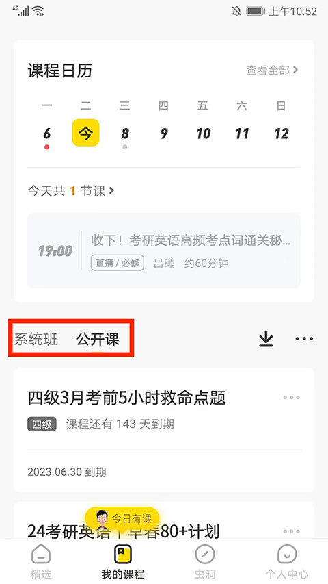 2、进入课程中心界面,分为“系统班”和“公开课”栏目,