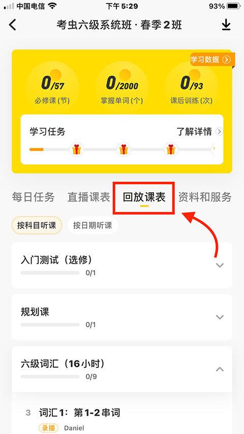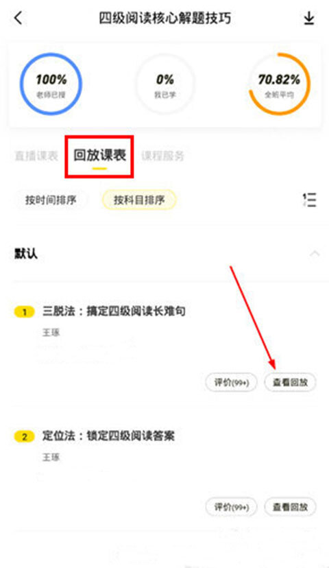 3、选择“回复课表”选项,然后点击需要的课程选择“查看回放”即可观看过期的课。