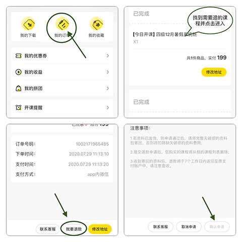 注意:自主退款预计到账时间2-7个工作日。公开课不支持退课退款。