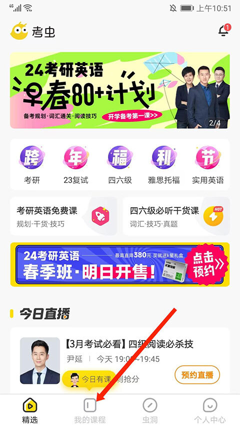 1、打开考虫app最新版,选择下方“我的课程”选项,