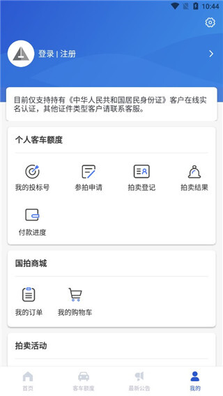 2、安装完成后我们打开上海国拍app进入到首页,在这里我们可以看到有客车额度、网点预约、竞价拍卖、国拍商城。