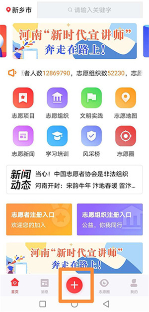 1、单击底部菜单栏【我的】,在志愿河南APP右下角单击我的。