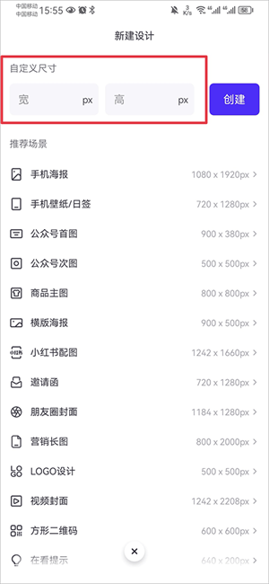 4、接着输入图片的宽和高,当然你也可以选择推荐场景中的尺寸
