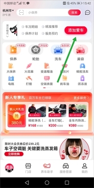 1、启动并登录天猫养车应用程序,进入主界面后点击页面右上角的【添加爱车】按钮。