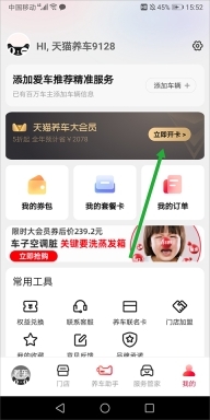 5、如果用户需要继续添加车辆,需要开通会员,会员开通后可以添加上限为3辆的爱车,会员开通方式是进入【我的】页面中点击【立即开卡】即可