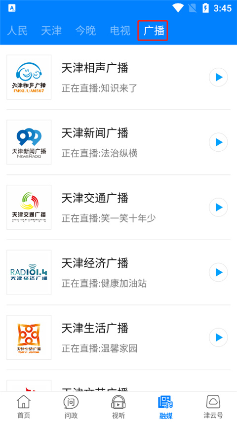 “直播”板块依托天津广播电视台的资源优势,提供11套电视节目、11套广播节目的全天候直播,为用户带来便捷、流畅、清晰的视听体验。