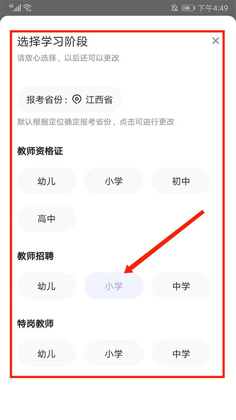 2、进入题库学习阶段设置界面,包括“报考省份”、“教师资格证”、“教师招聘”和“特岗教师”,选择需要的地区、阶段和年级,这里以为江西小学教师招聘为例,