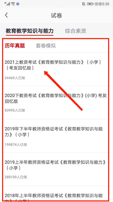 5、进入试卷选择界面,分为“教育教学知识与能力”和“综合素质”,选择需要的试卷即可,