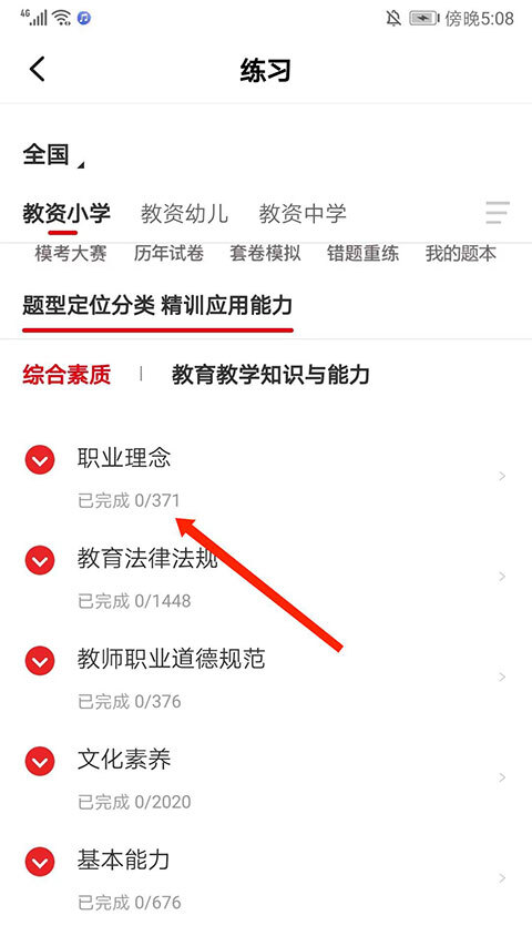 2、进入练习界面,往下滑动,选择练习的题目,这里以“职业理念”为例,