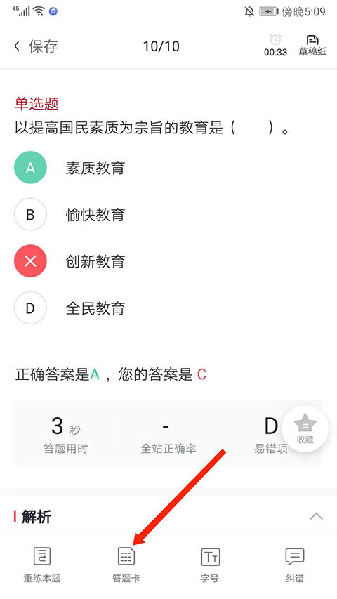 5、可以看到已返回到第一题,再次点击“答题卡”界面显示空白,即可开始重做题目了。