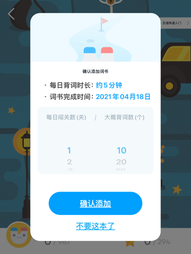 3.进入后点击左上角的返回按钮后,会弹出确认添加词书的窗口,在这里我们就能够选择每日的闯关数量和背词的数量了。