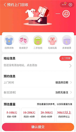 2、填写您的地址,挑选顺丰快递员上门的时间,根据衣物的大致重量选择合适的档次,最后确认并提交。这样就完成了预约上门的步骤,接下来只需耐心等待快递员上门取件即可。