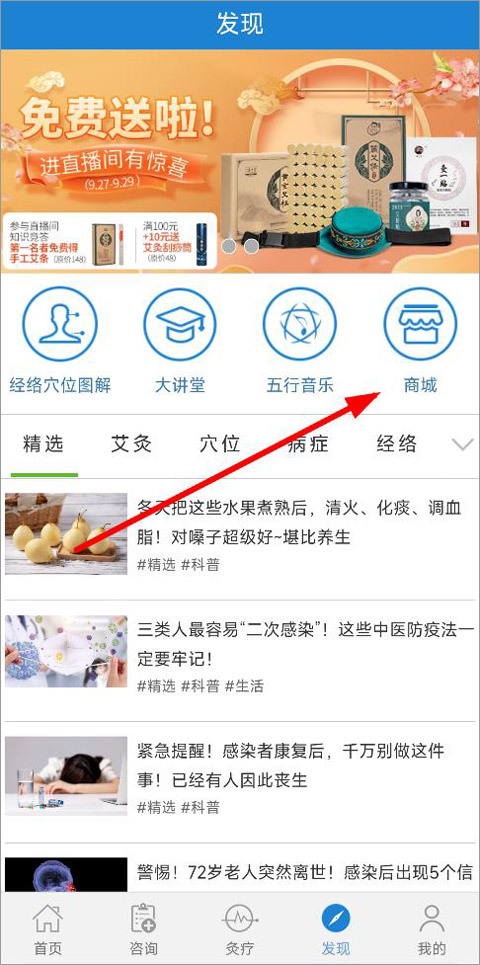 5、进入发现页面,用户能够知晓经络穴位图解、五行音乐、大讲堂课程,以及获取一些养生相关资讯,此外,还能开启商城选购养生仪器。