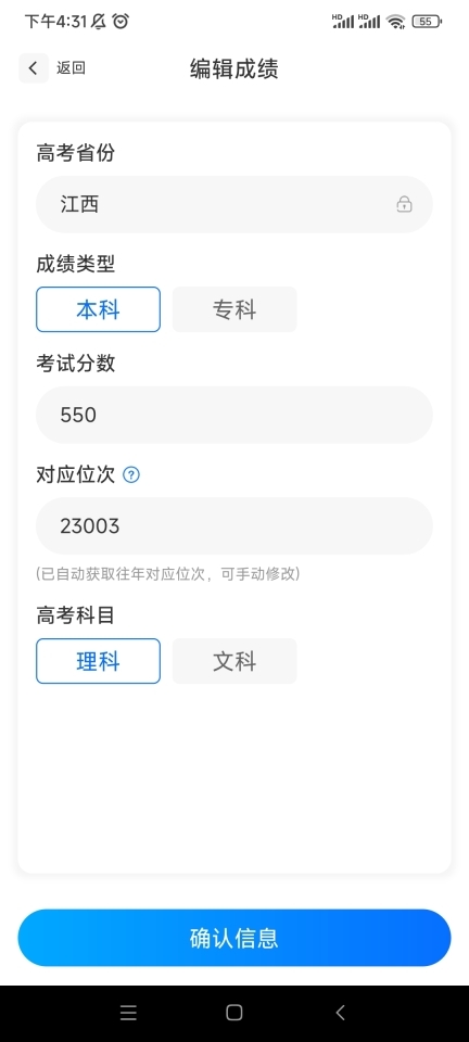 1、在本站下载安装app后,打开app,填写高考省份,考试分数,理科或文科等。