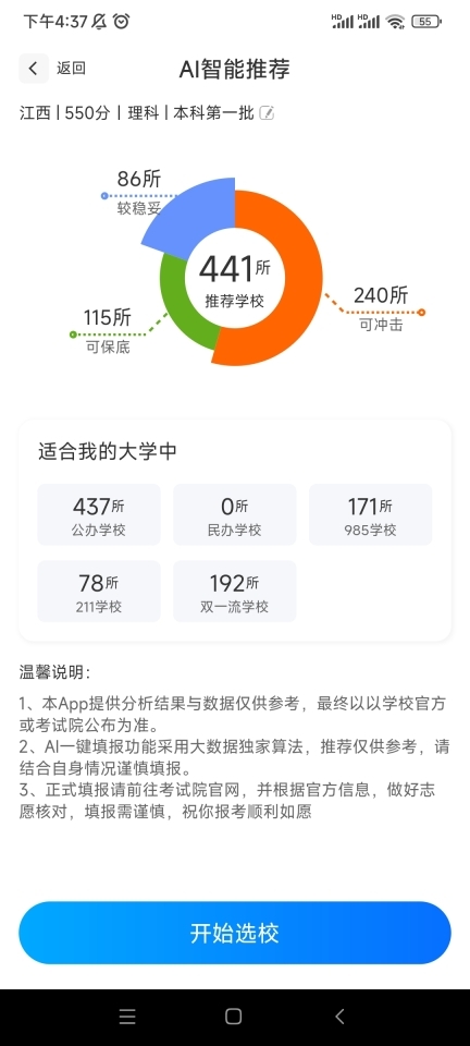 2、在首页可以看到适合你的大学的数量,点击AI智能选志愿,可以看到各种类型院校的数量。