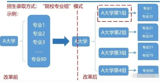 2. 填报方式:招生录取方式变更为“院校专业组”(批次 + 院校 + 专业组 + 专业)模式。其中,院校专业组由招生院校依据不同专业(类)的人才培养需求、选考科目要求等来设置。每个批次会按照投档模式、招生院校数量等差异,设置1 - 40个数量不等的院校专业组志愿。而每个院校专业组志愿下,又设有6个专业志愿以及是否服从专业调剂的选项。