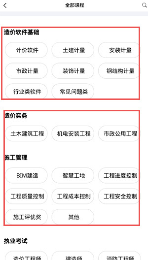 3、点开课程,造价软件基础、造价实务、施工管理、职业考试等,还有精彩的直播课程、免费课程;