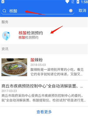 3、在搜索栏中搜索"核酸",然后点击核酸预约检测