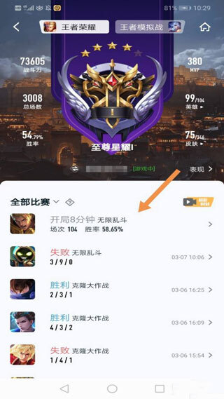 3、此刻,我们便来到了“战绩”页面,在页面右侧,能够看到自身的战斗力数值为“68580” 。