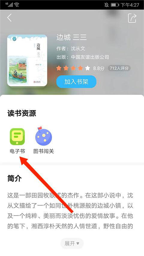3、进入书籍界面,在读书资源界面,选择“电子书”选项,