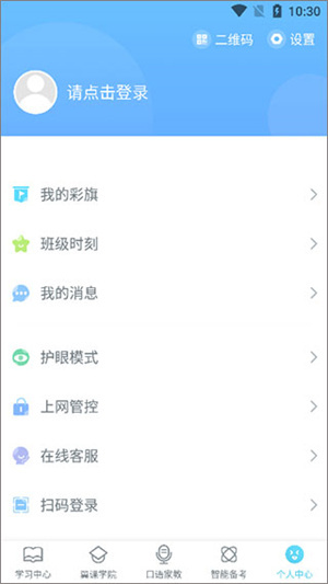 在【个人中心】界面,可以看到我的彩旗、班级时刻、我的消息,同时还有护眼模式等功能帮助你更好的进行学习。