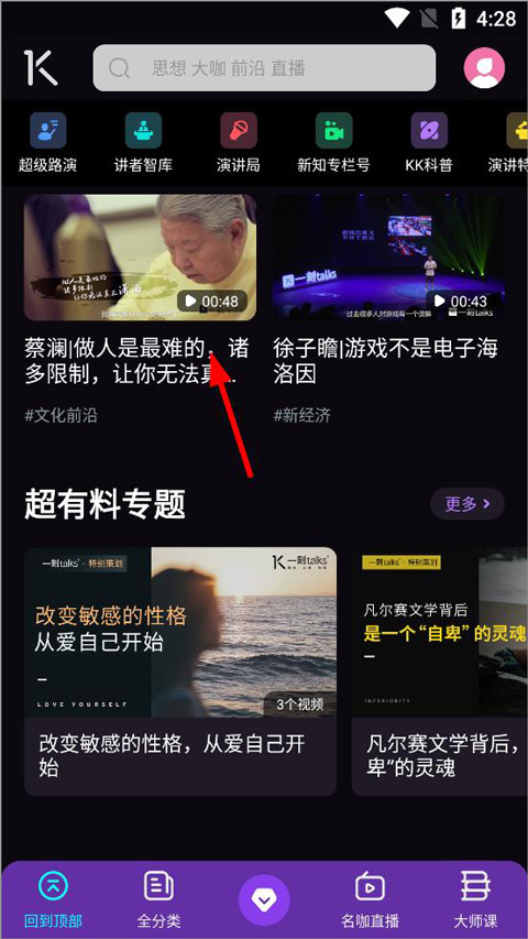 1. 打开一刻Talks应用程序,登录后进入首页,在发现页面,用户能够看到超级路演、讲者智库、演讲局、KK科普等栏目,点击其中的大师课。