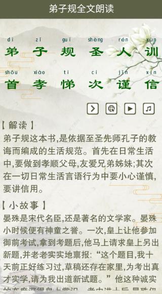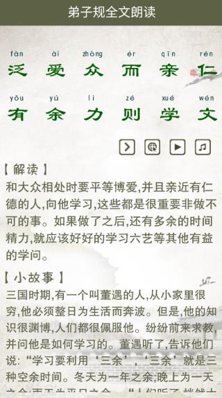 2.两种学习模式:一种分段朗读解释便于孩子家长共同理解学习弟子规;一种全文顺序循环朗读,逐行跟踪滚动显示当前朗读内容,便于孩子跟随一起咏读学习。