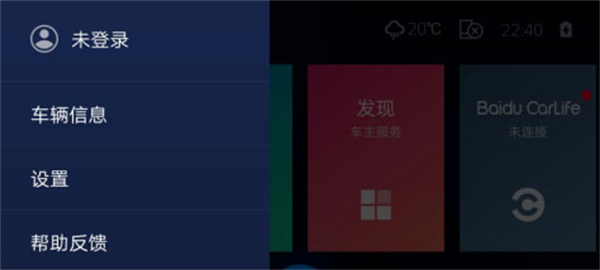 6、点击左上角的用户图标,打开用户登录界面及车辆信息入口 及设置功能,点击”未登录“进入登录界面,可以直接使用百度账号登录。