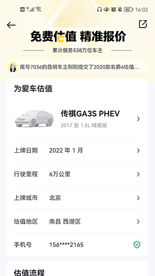 5、填写与车辆有关的信息,点击免费估价,然后点击获取验证码,输入验证码,再次点击免费估价。