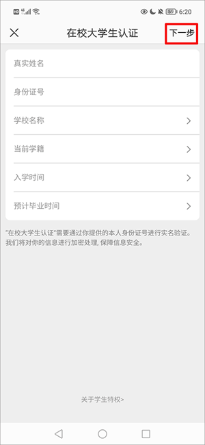 3、接下来,于在校大学生认证界面准确填写真实姓名、身份证号、学校名称、当地学籍、入学时间以及预计毕业时间,填完后点击左上角的“下一步”即可。