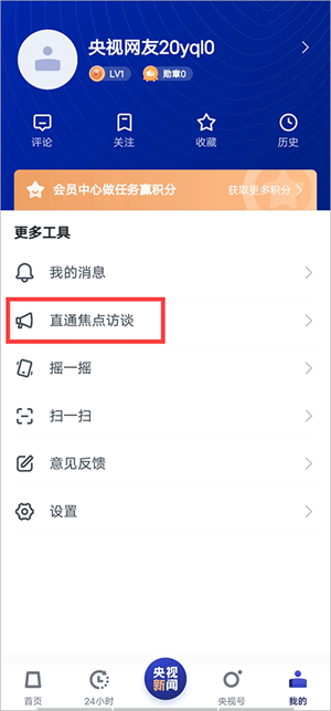 1、进到软件内后,点击我的界面,在界面的更多工具下方可以看到有一个“直播焦点访谈”