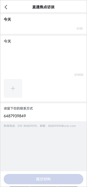 2. 进入投稿界面,依次输入标题、内容,还能添加相关图片,并留下联系电话,完成后点击“提交材料”,就能成功投稿。