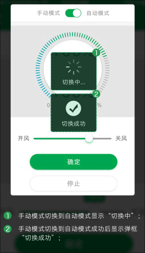 在手动模式中,通过滑动屏幕下方的进度条,来选择想要调节的风口大小,接着点击“确定”按钮完成调节操作;若要停止调节,则点击“停止”按钮,具体操作可参考下图。