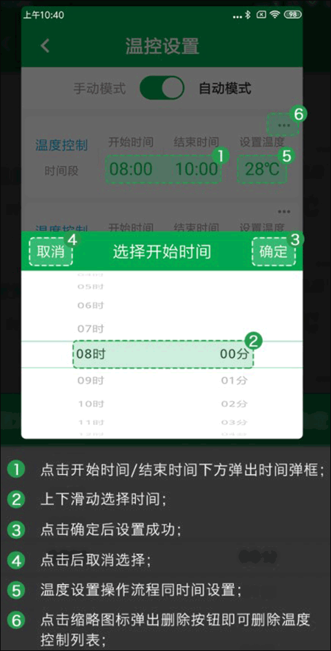 在自动模式中,需设置3段,每一段分别对应时间与温度。点击时间或温度来选择目标值,最后点击确认保存按钮就行,如下图所示。