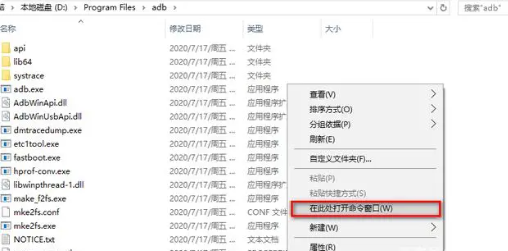接下来,在电脑上下载并解压ADB工具包,无需安装,解压后,在adb文件夹内空白处按住键盘“shift”键再右击鼠标,即可看到下图所示,点击即可。