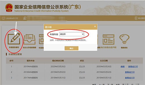 点击年度报告填写,并选择年份;注意,以前年度未填报的需要先填报以前年度;