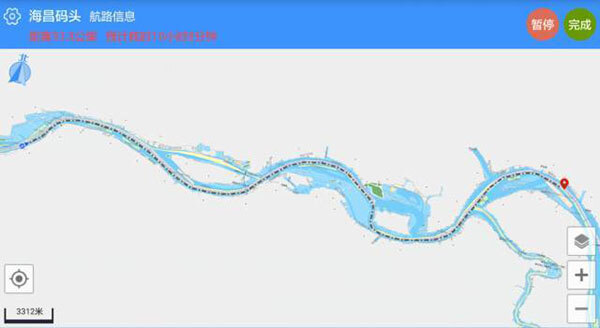 2、点击查询结果,就能直接在图中定位海昌码头的实际位置,同时显示海昌码头与你船舶之间的距离以及预计航行耗时。接着点击“去这里”,系统就会规划出从你船舶实际位置到海昌码头的航线。