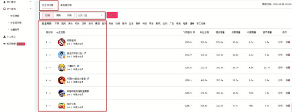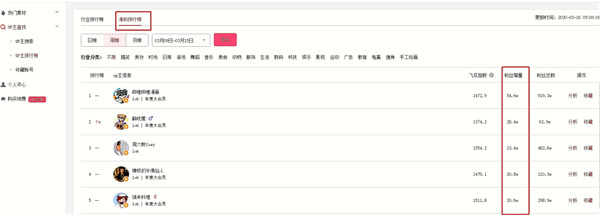 3、除了可以查看当日的,还可以按周榜、月榜查看涨粉榜单,飞瓜数据还可以分行业查看不同行业近期的涨粉黑马数据。