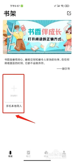 进入书架,点击(手机本地导入)选项,如图标注所示。