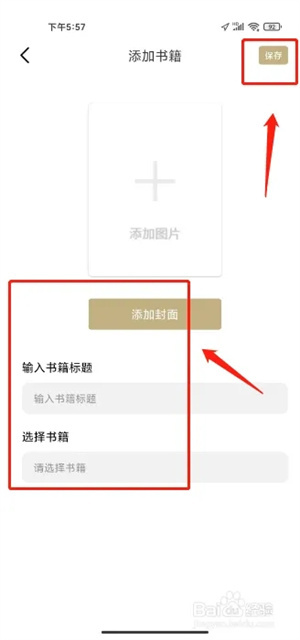 进入添加书籍,添加封面、输入书籍标题、选择书籍,点击(保存)选项,如图标注所示。