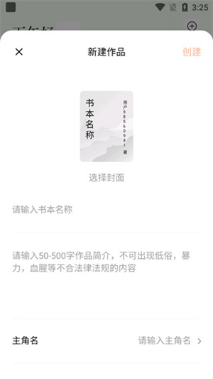 3、输入书名、介绍、主角名、目标读者等信息,最后点击创建,然后就可以发布自己的作品了。
