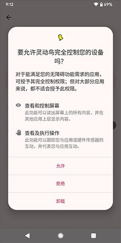 2、为防止弹窗信息被状态栏遮挡,点击下方“无障碍未开启”按钮,跳转至无障碍设置页面,并赋予灵动鸟无障碍权限。