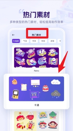 1. 于首页点击「热门素材」,从贴纸、气泡、字体等分类中挑选,就能套用多种风格素材开展视频创作。