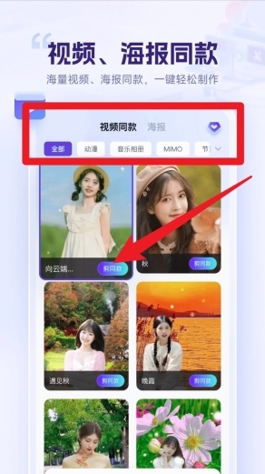 2. 前往「视频同款」板块,点击心仪的模板,就能一键导入视频和图片内容,创作出高质量作品。