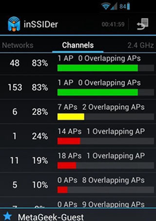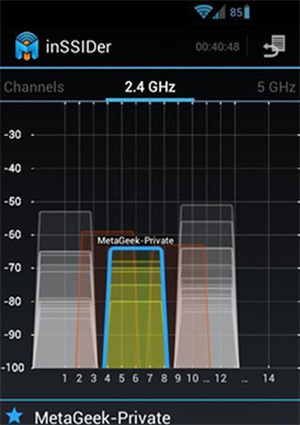 inSSIDer为广大用户提前准备了一项前卫功能——查看5GHz频段信道使用情况,其显示效果与2.4GHz频段一致。相信在双频段无线网络普及之时,inSSIDer依然会为你提供相应的选择。