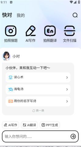 快对AI,堪称一款极为强大的学习工具,能够全方位满足现代学生与家长在学业方面的各类需求。其功能宛如一位超级得力助手,助力你轻松实现拍照搜题、AI写作、翻译文档以及扫描文件等操作。不仅如此,快对AI中还有智能小助手“小对”,无论你是好奇海龟汤的剧情,还是寻求专业知识解答,只需输入问题,它即刻就能给出答案,就如同一个便捷无比的搜索引擎,着实让人使用后爱不释手。